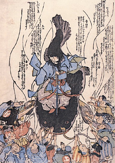 Kashima, the god of thunder and blades, is the deity responsible for subduing Namazu. Here he is using a sword, though he might also use a special “keystone,” to hold down the catfish and prevent it from thrashing and causing an earthquake.