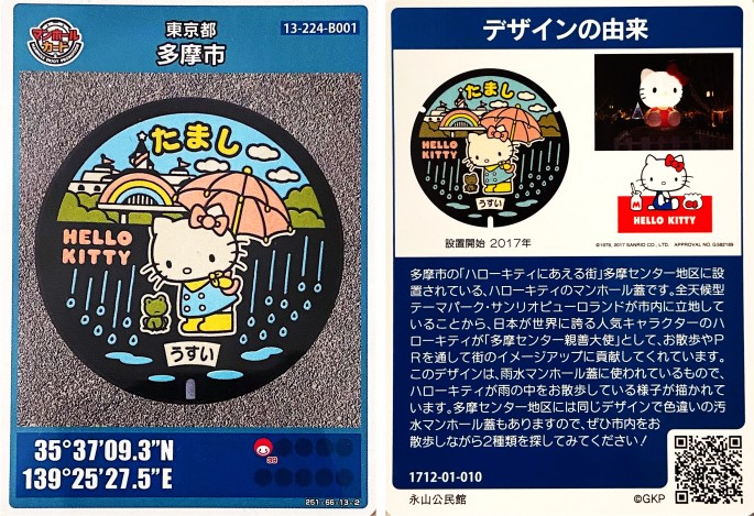 This image shows the two sides of a Hello Kitty manhole cover trading card from the city of Tama 多摩市 in western Tokyo Prefecture 東京都. 市 means city and 都 means capital or metropolis and is the only one of Japan’s 47 prefectures that uses this designation. Most use -ken, but the 4 in use are encapsulated by the word Todōfuken 都道府県.